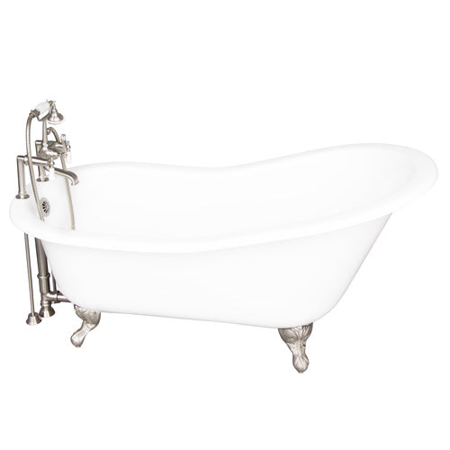Relax while you bathe in this stunning cast iron slipper tub with ball and claw feet. Beautiful elephant spout includes riser and shower enclosure....