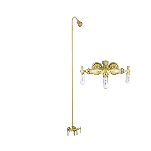 An old-style spigot, 3 porcelain lever handles and a traditional styled brass shower head complete this charming, yet elegant tub filler.