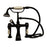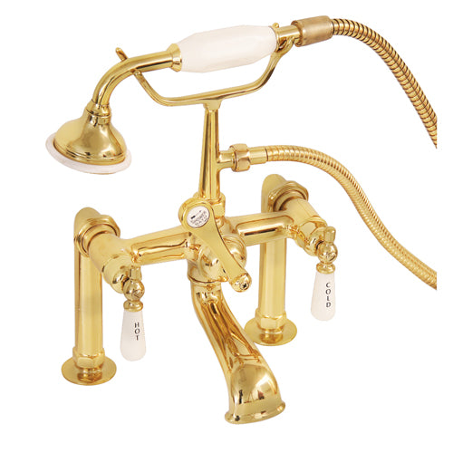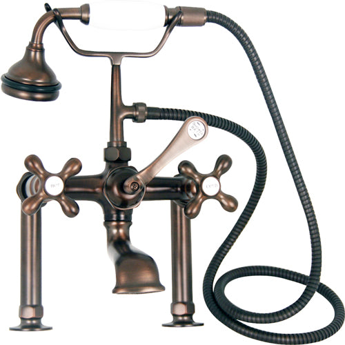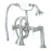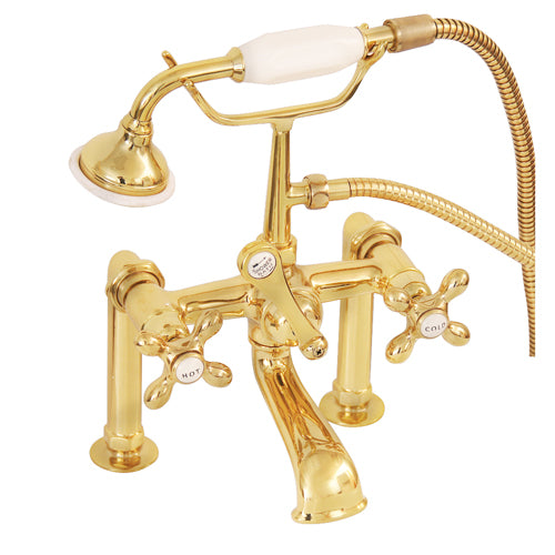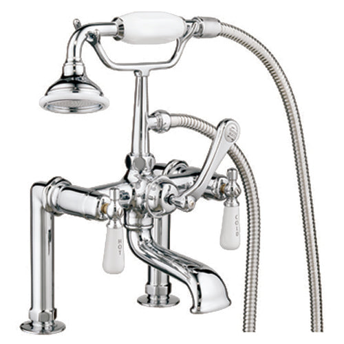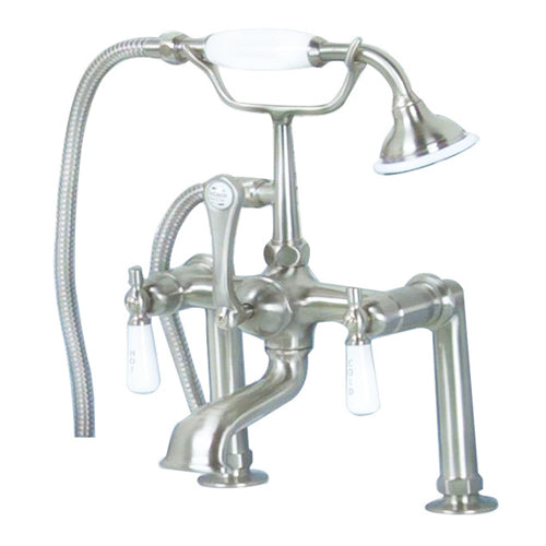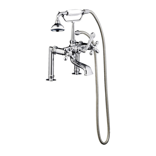 This stylish rim-mounted leg tub faucet has a hand held shower perched upon a wide elephant spout.
