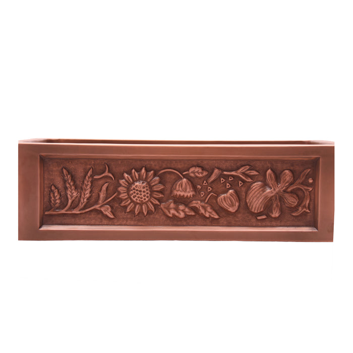 This copper apron-front sink will charm you with its design as much as it will provide you with a long life of hardy use. Featuring a whimsical floral design on its front, it will bring a naturally decorative air wherever it is placed. Sporting an antique copper patina finish, you are certain to be swept off your feet by its durability and style.