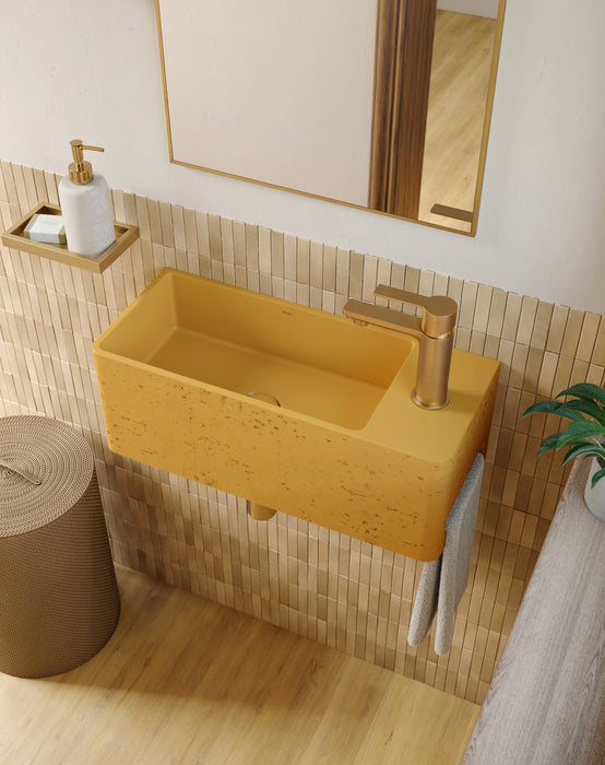 Galini combines a slim rectangular basin with an integrated towel rail—a discreet design that optimizes space in suites, powder rooms, and small bathrooms. Measuring 21 7⁄8" wide and available in three colors, it’s a functional piece with thoughtful design details.