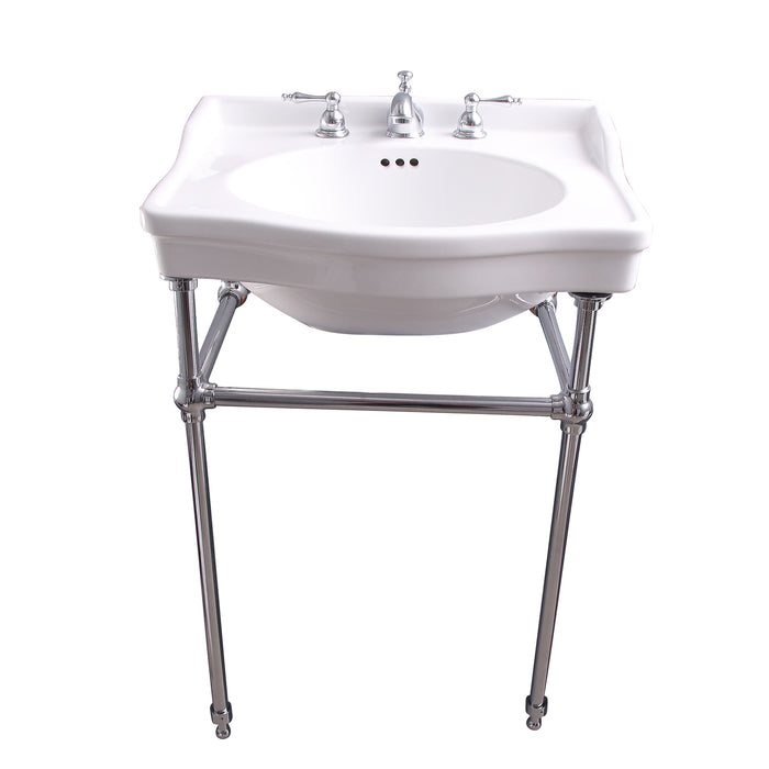 Take command of your bath décor with an impressive console sink from Barclay. Cali is a demure china basin supported on brass legs. A decorative backsplash accents the back of the basin.